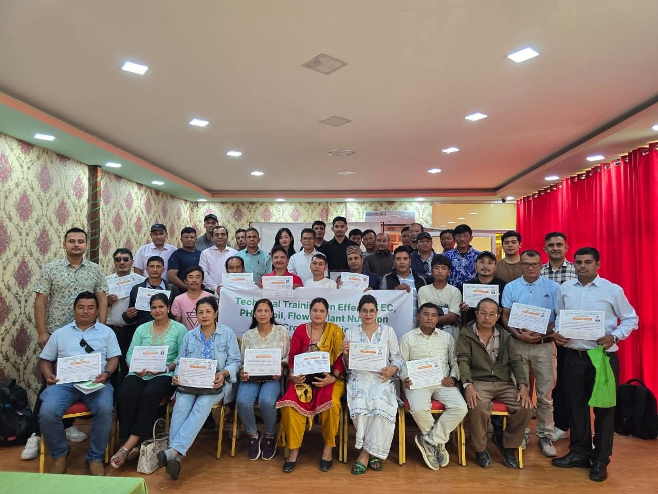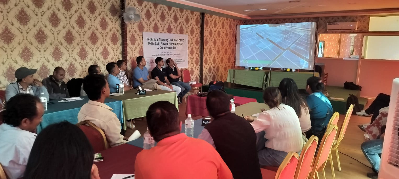 Floriculture Cooperative Sastha Limited organizes various trainings for its member’s by on the requirements basis to produce quality flowers. Accordingly, at the beginning of the new fiscal year 2082/083, nursery growers and fresh cut flowers growers the training held about the pH and E.C. of soil and water as the basis of production. And the introduction of EC and its effect on the growth and development of plants and 3-day training related to nutrition and crop protection were organized from 5th to 7th of Bhadra 2083, starting with Arambha restaurants and growers firms. The training was completed facilitation under the training of 2 trainers from Rise N Shine Bio farm, Pune, India.